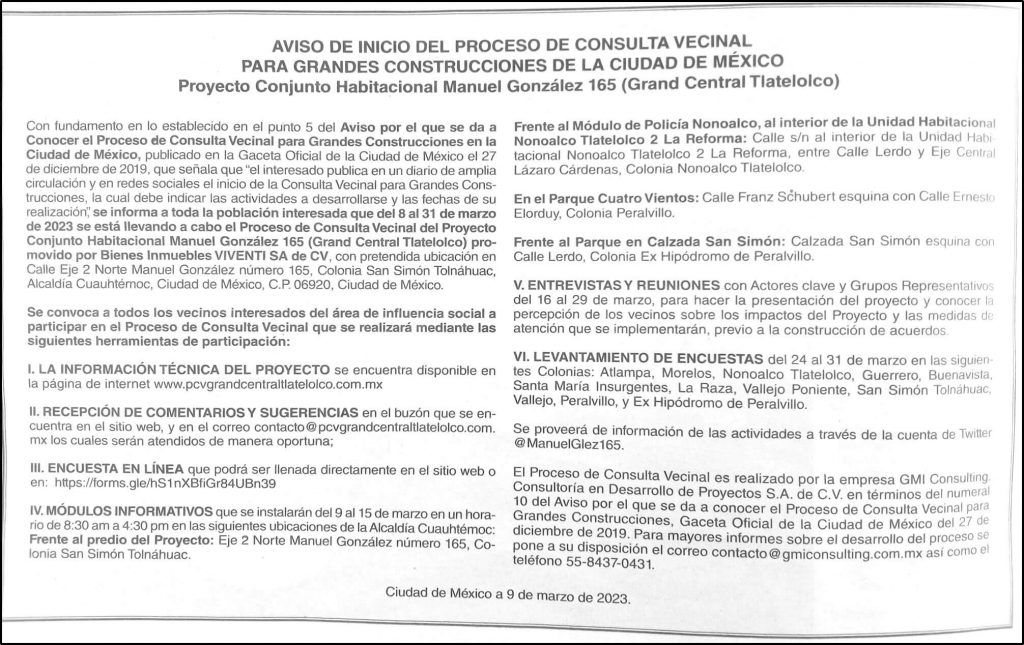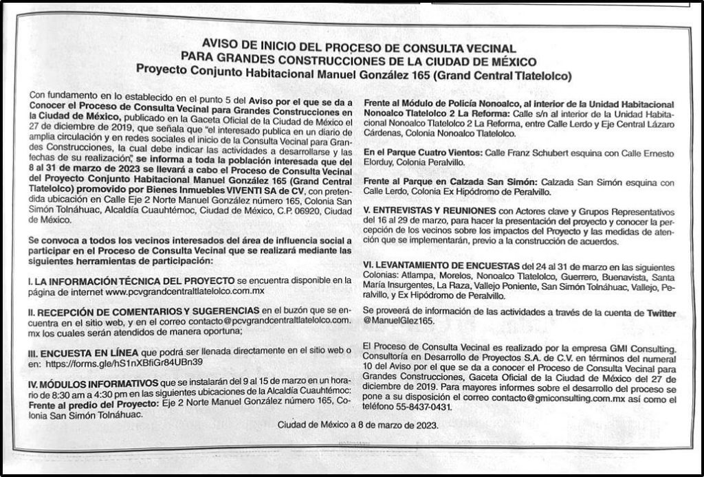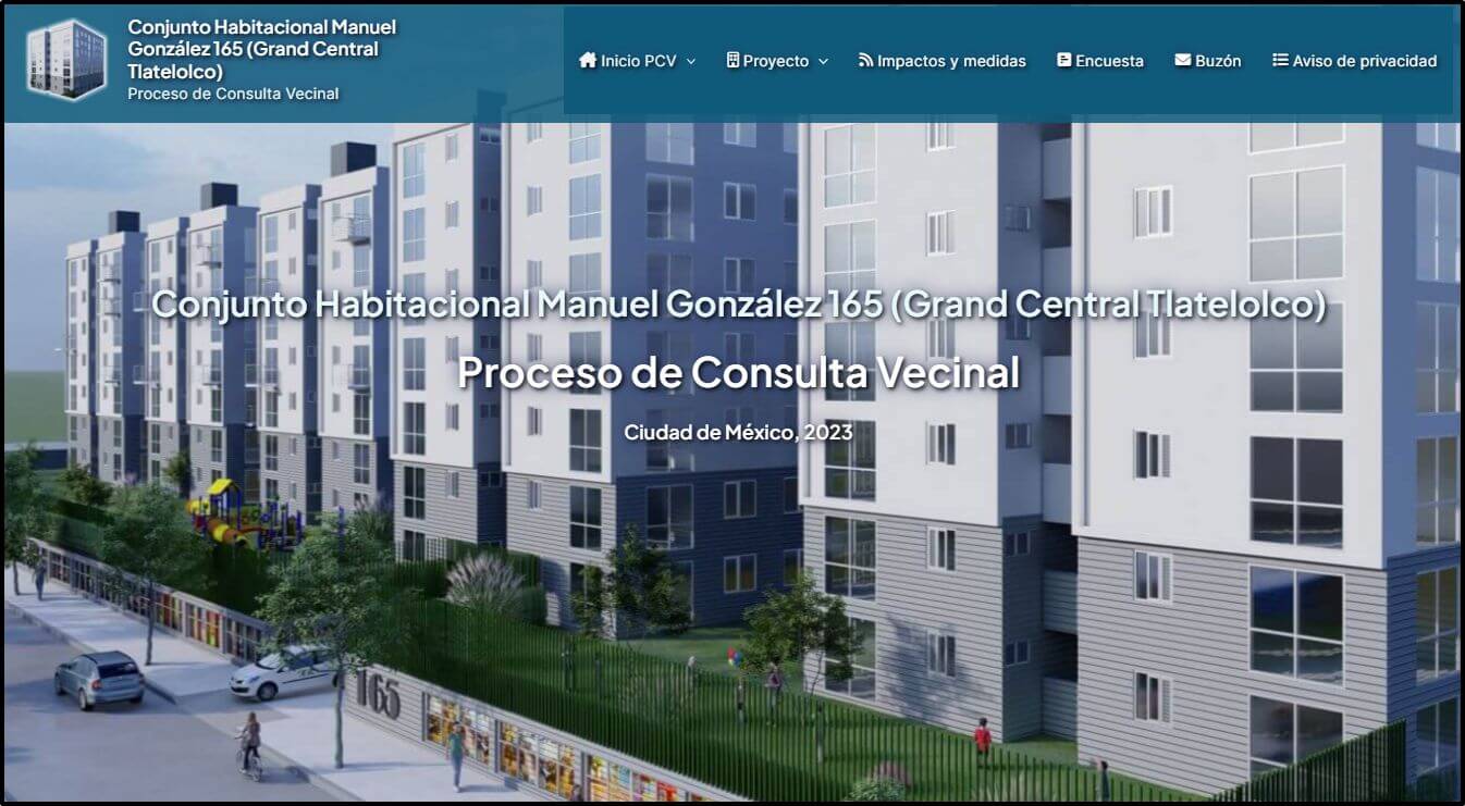La integración del Estudio de Evaluación de Impacto Social del Proyecto Conjunto Habitacional Manuel González 165 (Grand Central Tlatelolco) incluyó la realización de un Proceso de Consulta Vecinal que se ejecutó de manera ordenada y sistemática, atendiendo en todo momento las mejores prácticas internacionales y cumpliendo con todas las actividades programadas.