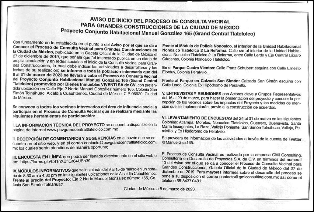 El 8 y 9 de marzo se publicó en el periódico La Jornada el Aviso de Inicio del Proceso de Consulta Vecinal en el que se señalaban las fechas y actividades programadas y se convocó a los vecinos a participar en ellas.