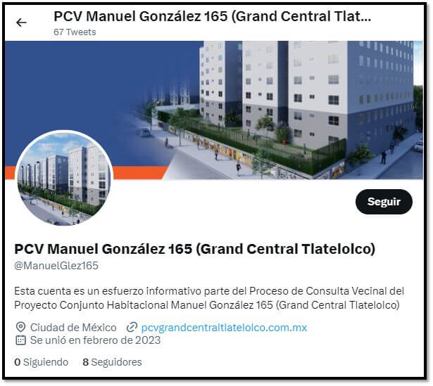 Se abrió la cuenta de Twitter @ManuelGlez165 para informar de las actividades del Proceso de Consulta Vecinal y convocar a los vecinos del área de influencia social a participar en ellas. En total se publicaron 67 tweets sobre los siguientes temas: